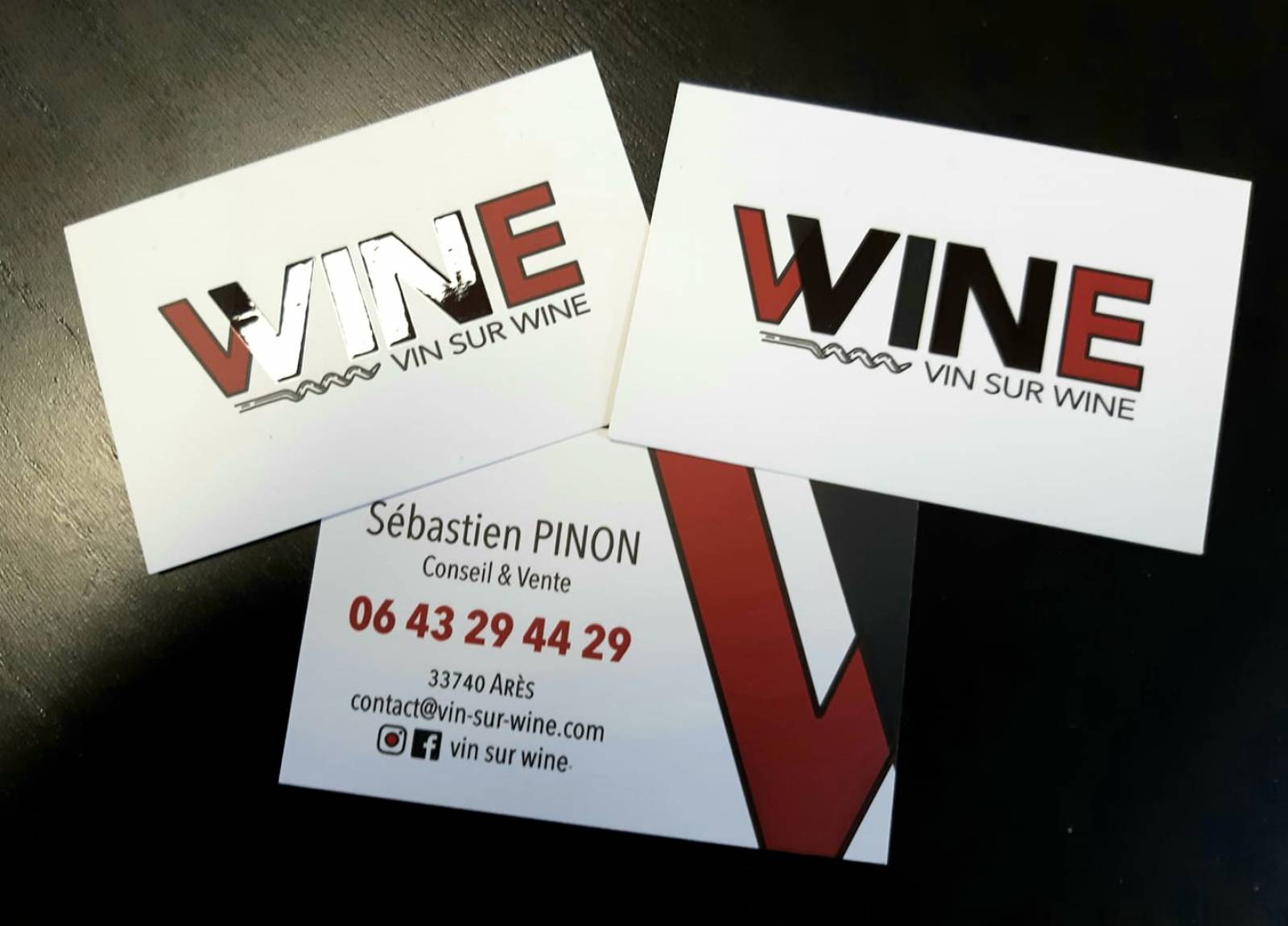 Nous avons créé un logo pour l'entreprise Vin sur Wine basée sur Ares, bassin d'Arcachon. Nous avons volontairement gardé les couleurs du vin (rouge bordeaux) associées au noir et blanc afin d'apporter une touche d'élégance qui caractérise ce milieu. Les cartes de visites sont de fait restées sobres et élégantes grâce à la touche de vernis sélectif rigoureusement appliquée sur une partie des lettres.
