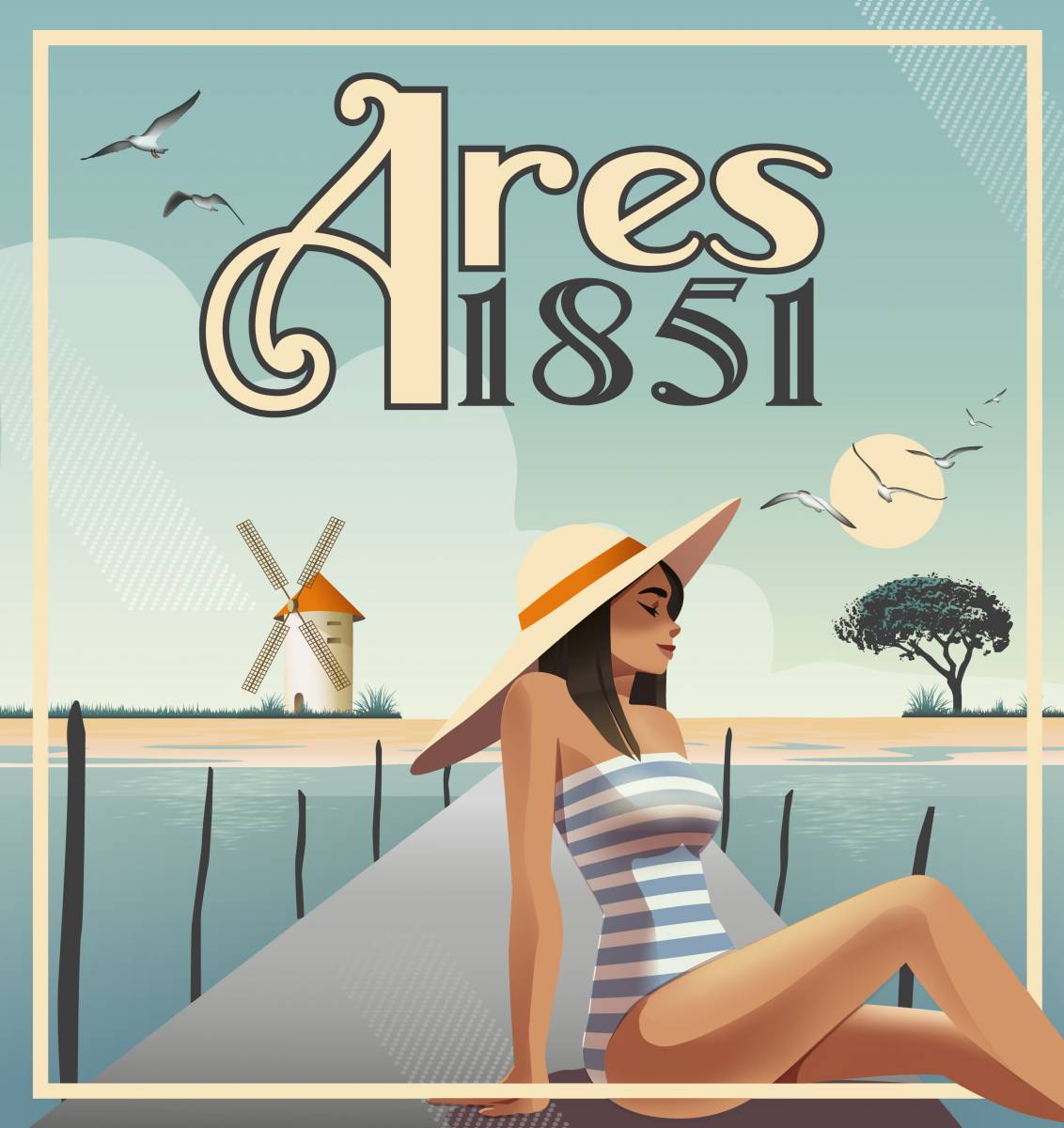 Arès 1851 ... une illustration personnalisée dans le style vintage commandée par la mairie d'Arès à notre agence du Bassin d'Arcachon.