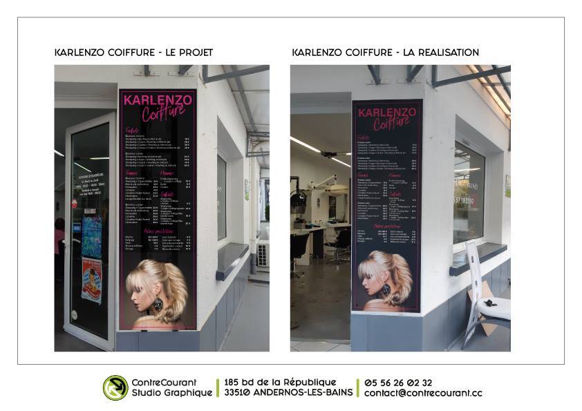 Votre spécialiste en communication visuelle, Contre Courant, crée pour votre salon de coiffure des panneaux dans le but d'habiller la vitrine de votre salon de coiffure sur le Bassin d'Arcachon et la rendre plus attractive. Le choix s'est porté sur des panneaux PVC en impression directe avec des v...